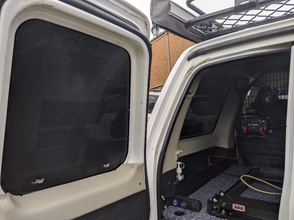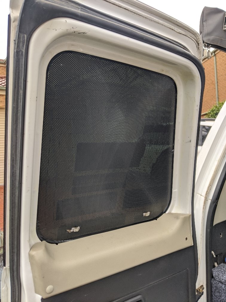 Black coreflute sheets from Officeworks. Cheap as. I did my two rear windows and the small barn door. Just remove the window trim, cut to shape, fit on the window and put the trim back on to hold it in place.