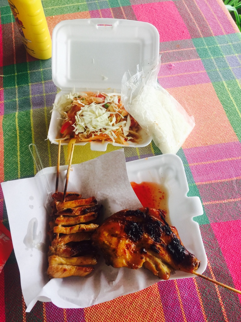 Chicken, pork, rice and fresh papaya salad $6 incl a tip