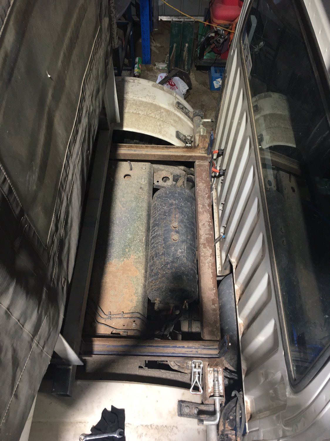 Firestone bellows & Koni 90 series shocks for it’s extra cab stretch overhang weight and full lower down to extended bumpstops removable trays ability too.
